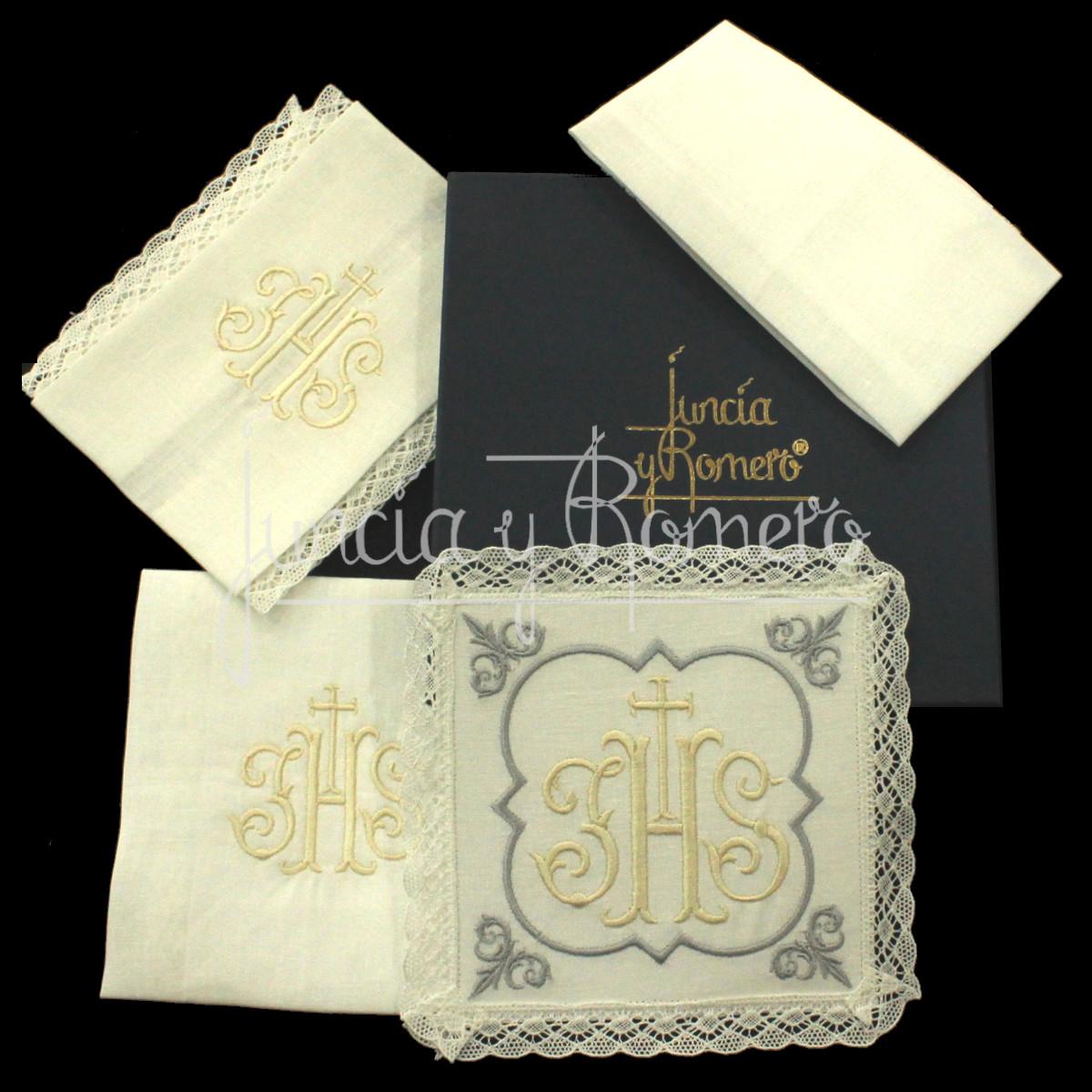 Conjunto de corporal, purificador, manutergio y palia fabricada en LINO PURO, con bordados en rayon 100% con dibujo de JHS y cruces en las esquinas de la palia.